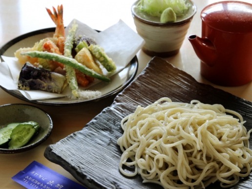 てうちそば でわ山形県産の玄そばを使用した挽きぐるみの田舎そばと甘さ控えめで飽きがこないもろこしが人気です