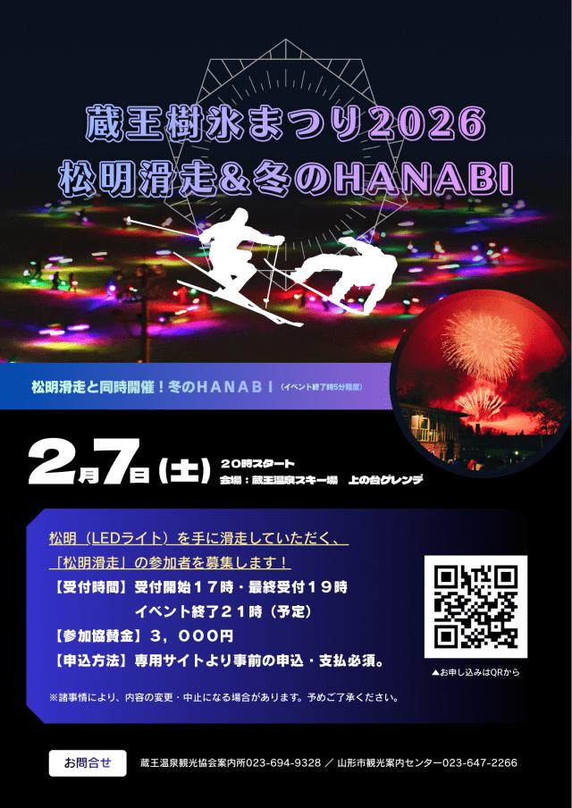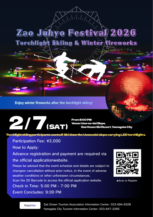 At Zao Onsen Ski Resort, the "Zao Juhyo Festival" is held to coincide with the best time to see the frost covered trees "Juhyo". Usual year, events such as "Torch ski Run", "Winter HANABI", and "Winter Working Cars Gathering!" are held during the festival period.