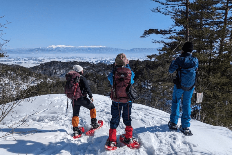 アウトドアガイドと一緒に冬の十分一山に登り、広大な盆地と日本百名山の絶景パノラマを堪能!