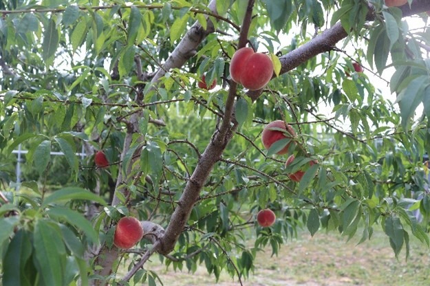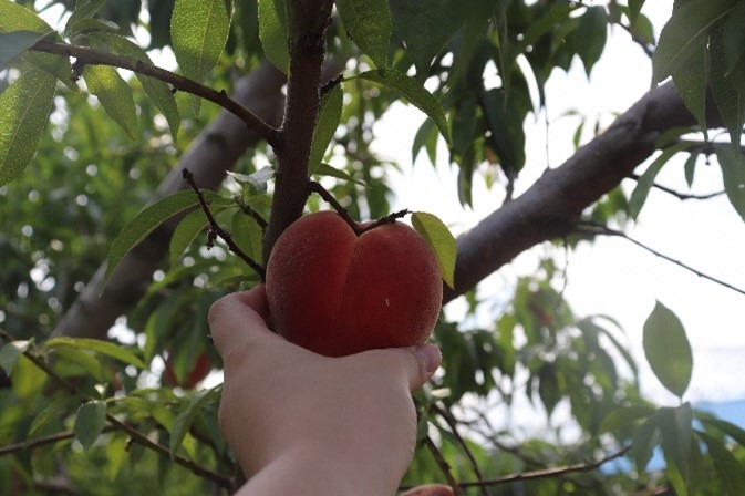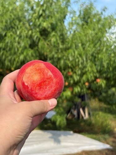 滝口観光果樹園では「樹上完熟」という育て方をしているため、他の果樹園さんではできない体験として、木の上で完熟している桃を自分でとってそのまま食べることができます!皮と果肉の間に一番栄養があるため、皮ごと頂きます。とても甘くて、飲み物の代わりになるぐらいみずみずしいです。桃は便秘・食あたり・美肌などの薬効があることが知られています。フルーツ狩りにはトイレや手を洗う場所、採ったフルーツを食べる場所などたくさんの設備が必要なため、どこでもフルーツ狩りができるわけではないそうで、とても貴重な体験をさせていただきました。木に生っている桃はたくさんの種類があり固めの桃や柔らかい桃、どれが熟しているのかなどを丁寧に教えてもらえました。今年の桃は連日の暑さにより糖度が高くなり、果肉が蜜入り状態になっています!もぎたてで完熟の桃はジューシーで甘く、普段食べている桃とは香りも食感も格別でした!普段体験できないことをたくさん体験することができたのでぜひ皆さんも訪れてみてください!