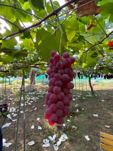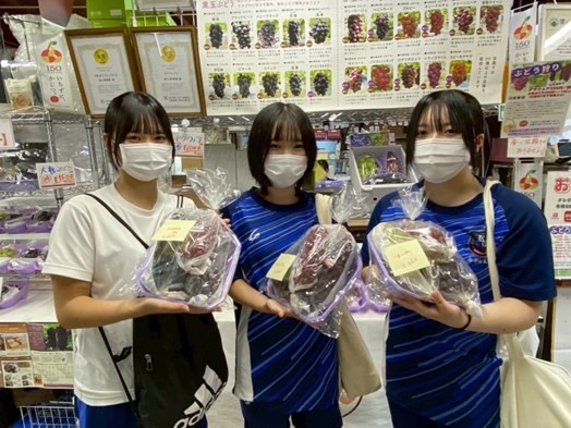 実際にぶどう狩りを体験してみて、漆山果樹園のぶどうに様々驚かされました。畑がとても広く、実際に沢山のぶどうが実っている様子を見て、その豊かさに圧倒されました。スーパーなどで売っているぶどうとは全然違い、一つひとつの粒が大きくボリュームがあることに気づきました。そのため、どのぶどうが一番おいしそうかを考えながら収穫することができました。部員同士で「こっちの方が大きいんじゃない」「このぶどうの方が粒が多い!」など話しながら、楽しく体験することができました。
