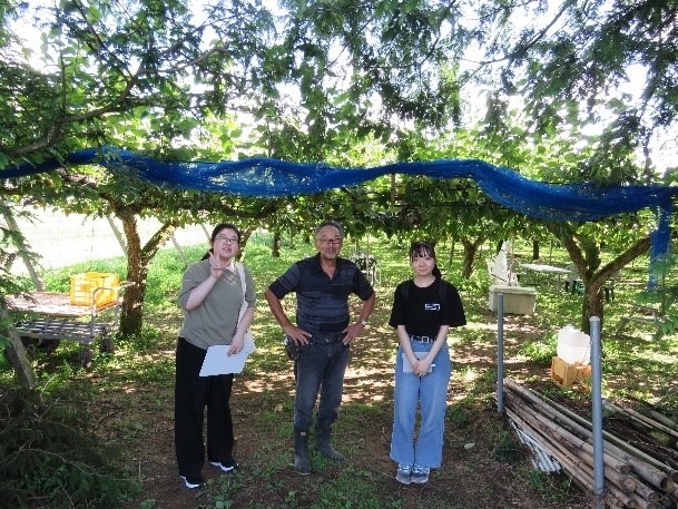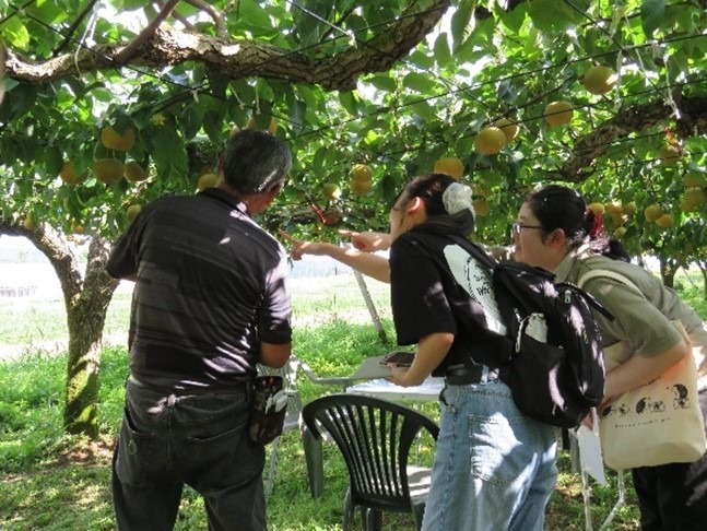 また、梨園も見学させていただきました。普段は収穫体験を行なっている場所で、幸水、豊水、南水という3種類の梨の木がありましたが、収穫体験で採れるのは幸水だけとのこと。理由は他の品種だと収穫可能かどうかが素人には分かりにくいからだそうです。梨を長年見ている小松さんだからこそわかる違いがあるのですね!