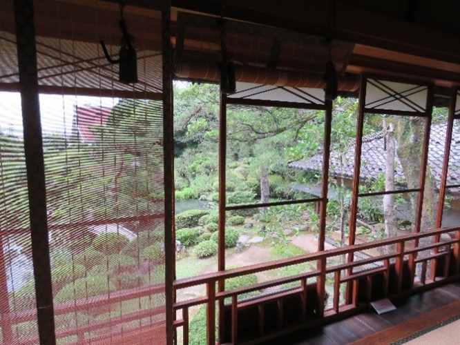 現在の展示館の前身となる「清遠閣」は、本間家第4代当主・光道により、文化10年(1813年)に建築された別荘です。現在は、茶室「六明盧(ろくめいろ)」を備えた京風書院造りの2階建てですが、建築当初は平屋建てでした。しかし、明治末の1908年(明治41年)に2階部分を増築し、庄内藩主や幕府要人をもてなす迎賓館、御座所として使われました。2階の座敷からは、池泉庭園の全景を見ることができ四季折々の景色を楽しむことができます。また、内装には今では珍しい手吹きのガラス窓やシャンデリアなど大正ロマン溢れる雰囲気が漂っており、当時の細かく緻密な工夫を楽しむことができます。そして、この2階には、1925年(大正14年)には後の昭和天皇が皇太子時代に宿泊されたとのこと!