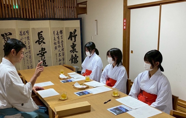 神職の方による講話では、日本最古のプロポーズをしたとされる神様、イザナギノミコトとイザナミノミコトについてのお話を伺いました。古事記に記されているその内容は、私たちの想像を超える壮大なものでした。