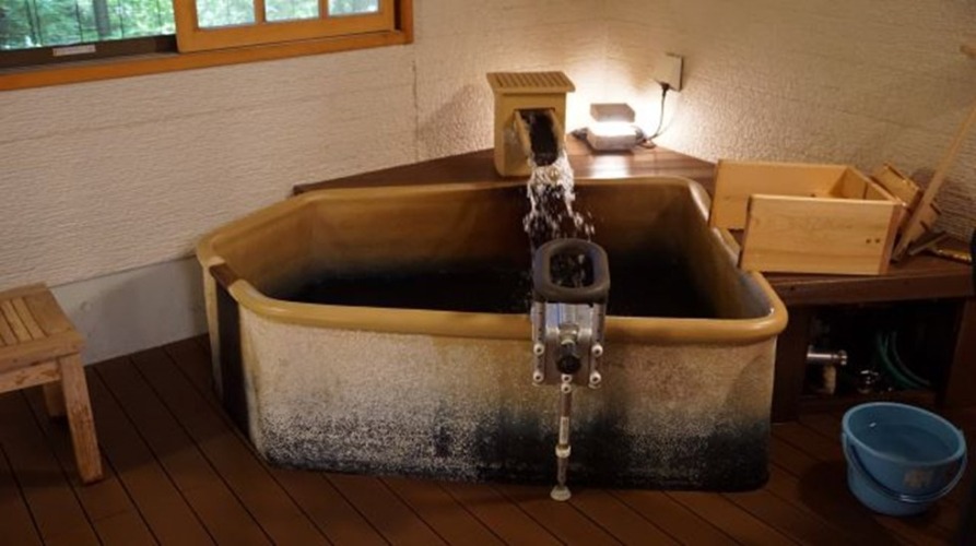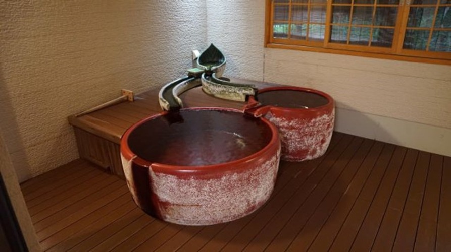 貸切湯庵の浴槽は「さくらんぼ」と「こま(将棋の駒)」をイメージして作られています。どちらも、大石田町次年子(じねんご)窯で作られた「やきもの」の浴槽。入るだけではなく、見て楽しいお風呂です。