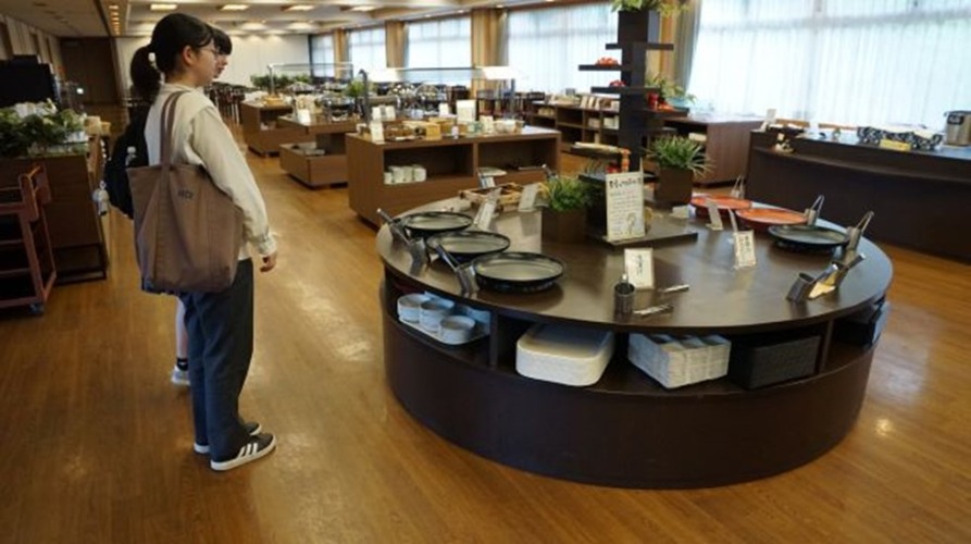 ②宿泊客の皆さまの朝食会場(バイキング形式)。
