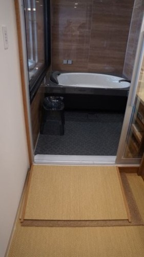 もともとは中庭にあった施設を改修した貸切浴室です。通路はフラットに、余裕を持って作られています。