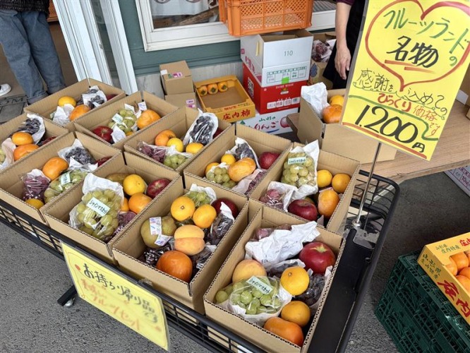 フルーツの店舗販売では、試食も用意されていて、おいしいフルーツをしっかり選んで購入できます。写真にあるフルーツランドの名物、旬のフルーツの詰め合わせ、これが1箱1,200円って信じられますか?