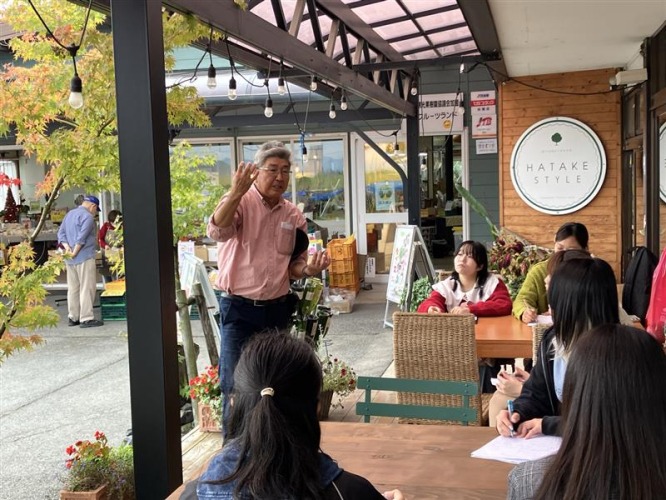 ラ・フランス狩りの後は、カフェのテラスで生産者の髙橋真也さん(代表取締役)が、ラ・フランス栽培について説明してくださいました。