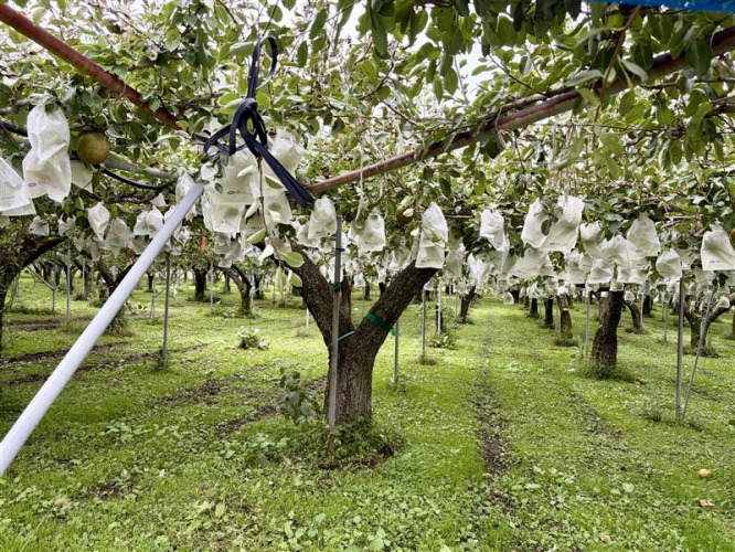 栽培は、春に花摘み(6つくらい咲く花を2~3つ残して摘む)をして、消毒作業、実がなったらひとつひとつに袋をかぶせて、時にはイノシシから畑を守って、と手間をかけて大事に栽培されています。平棚仕立てなので、冬も剪定作業があり、全部の枝を誘引しないといけないのでひと冬かかって終わるか終わらないかの大変さ。