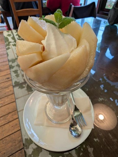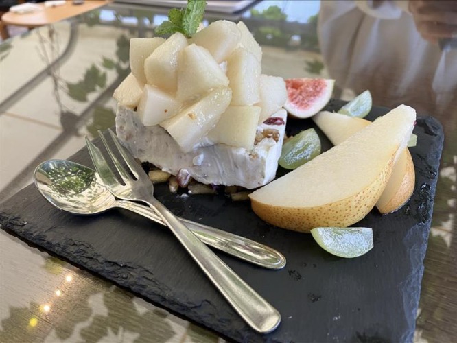 ラ・フランスは追熟が必要なので収穫後すぐには食べられませんが、カフェではすぐ食べられます!ゴロゴロのラ・フランスはふんわり柔らかく、高貴な香りがします。ラ・フランスの下の自家製フローズンチーズはさわやかな酸味があって甘いラ・フランスとよく合い、中に入ったチョコやドライフルーツの食感も楽しいです。