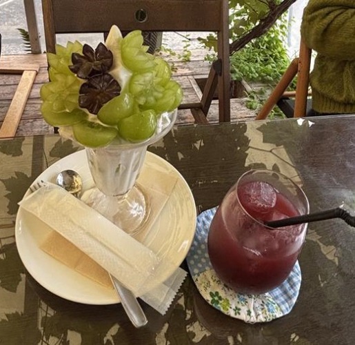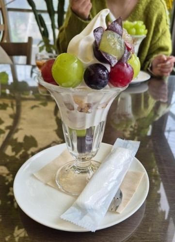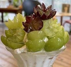 シャインマスカットを贅沢に使用したパフェ。飾り切りにより、見た目も楽しめる“映え”パフェ。最後まで全部シャインマスカットが入っています。バニラソフトも本当に濃厚!みずみずしいフルーツと相性が抜群でした!