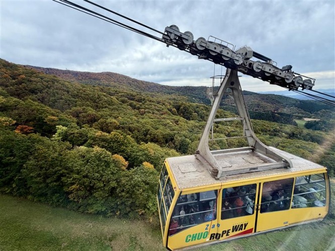 蔵王中央ロープウェイは、温泉駅から鳥兜駅までの全長1,787m、標高差524mを7分30秒で結ぶロープウェイです。ゴンドラは101人乗りで、1人は車掌さんの分だそうです。ペットも一緒に乗ることができます。