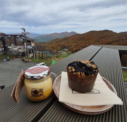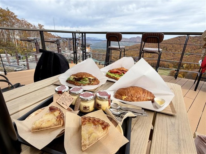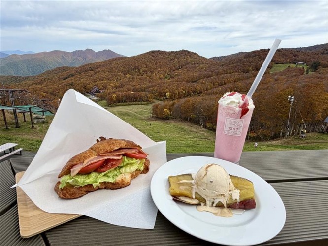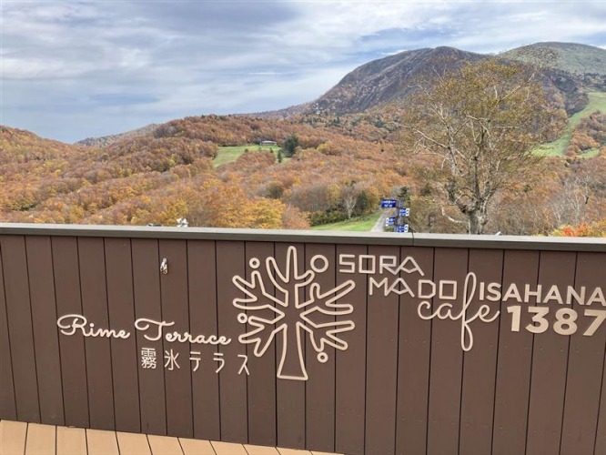 店内で食べるのもいいですが、蔵王の景色を一望できる霧氷テラスで食べるのがおすすめです。景色を背景にテラスの柵にカフェメニューをのせて撮る写真はとても映え!