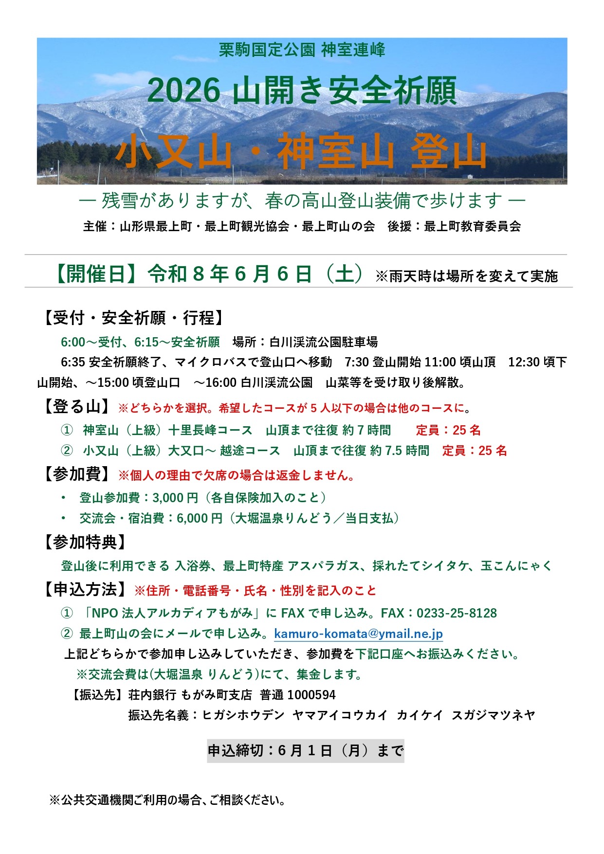 2026 神室連峰山開き安全祈願・神室山登山&小又山登山