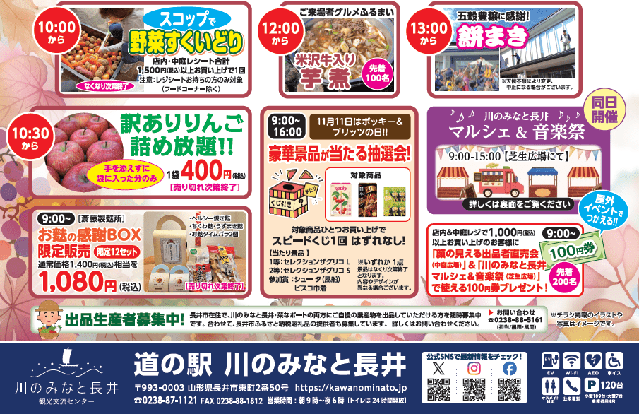 9:00~ 店内&中庭レジで1,000円(税込)以上お買い上げのお客様に「顔の見える出品者直売所(中庭広場)」&「川のみなと長井マルシェ&音楽祭(芝生広場)」で使える100円券プレゼント!(先着200名)