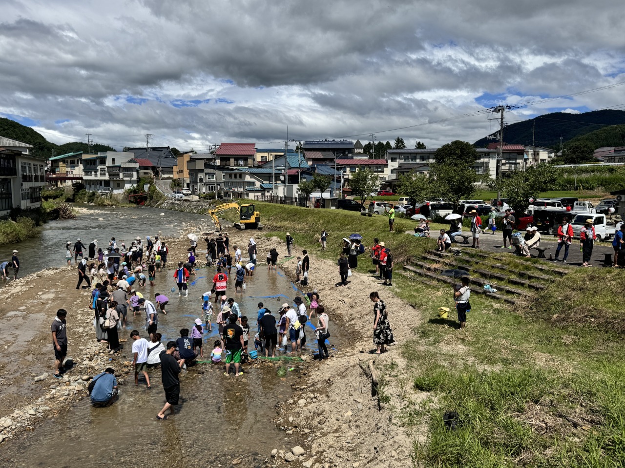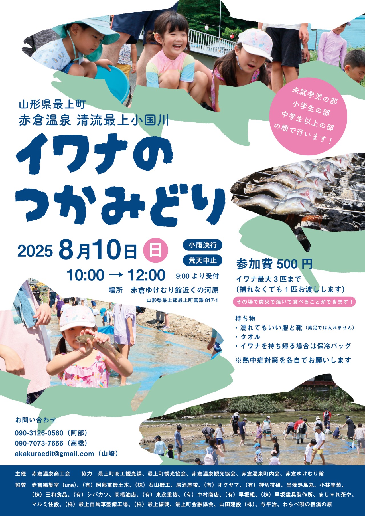未就学児・小学生・中学生以上の各部に分かれて最上小国川に設置した生け簀でイワナのつかみどりを行います!