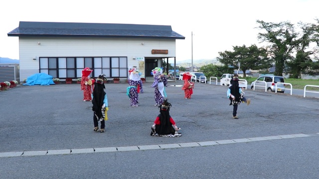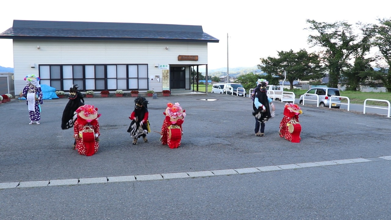 踊りは、太鼓(踊り子)唄歌い、笛ふきに合わせて踊ります。獅子踊りの一行は、雄獅子、雌獅子、友獅子、踊り子(中立、花水、岡ぶち)、笛吹き、唄歌い、まとい持、輪持ち、力士、面すりで構成されています。雌獅子を中心にして雄獅子と友獅子の三体の獅子と踊り子(太鼓)が踊ります。三体の獅子の服装は雌獅子だけが違います。獅子の踊り手は、小中学生が担当しています。