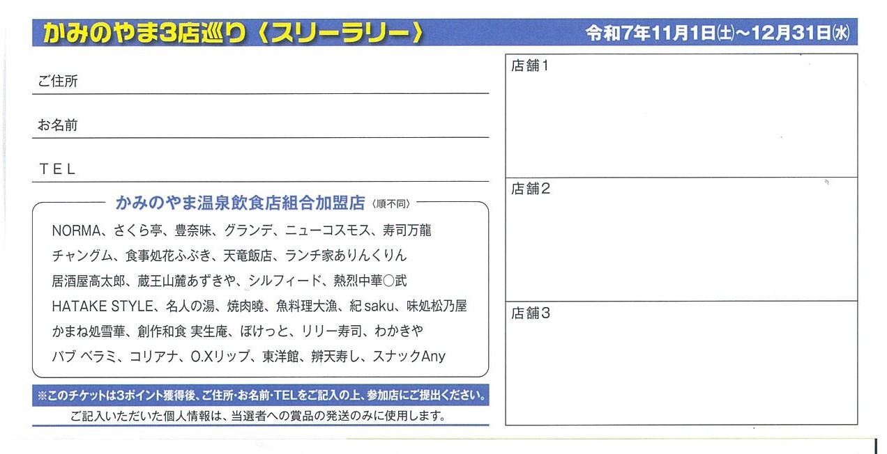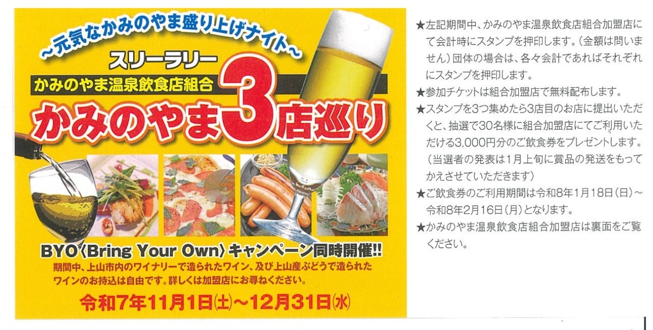 期間中、かみのやま温泉飲食店組合加盟店のスタンプを集めて応募すると、抽選で30名様に組合加盟店にてご利用いただける3,000円分の飲食券をプレゼント!