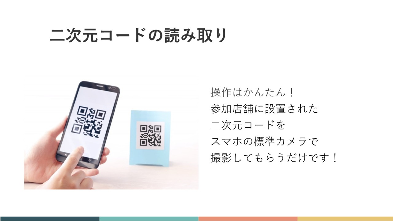 スマートフォンで参加店舗に設置された二次元コードを読み込むだけで簡単に参加できるデジタルスタンプラリーです。