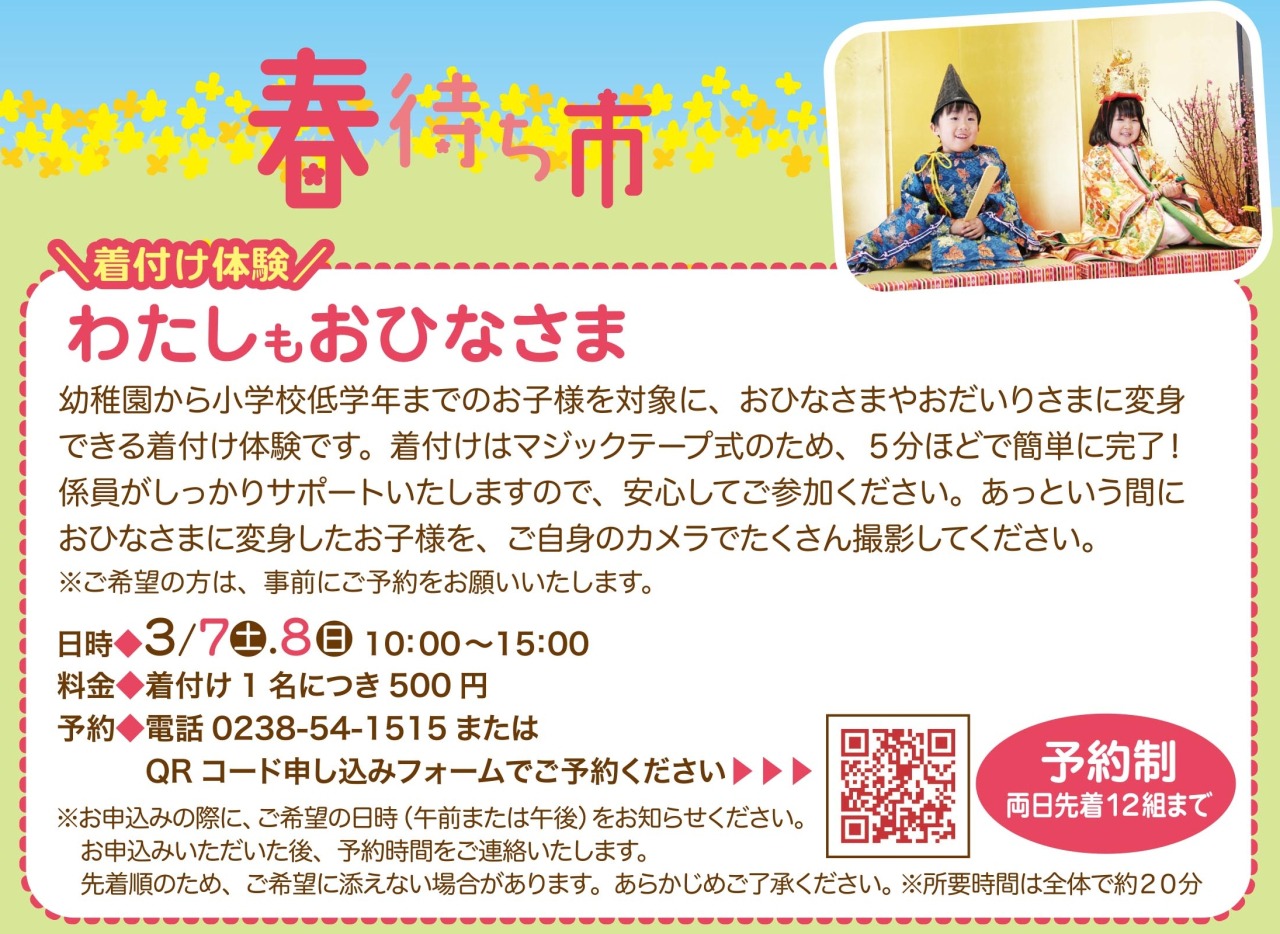 当日は、手作り体験や小物販売、おいしいフードが楽しめる「春待ち市」(3月7日~8日)も開催いたします。ぜひお立ち寄りください。