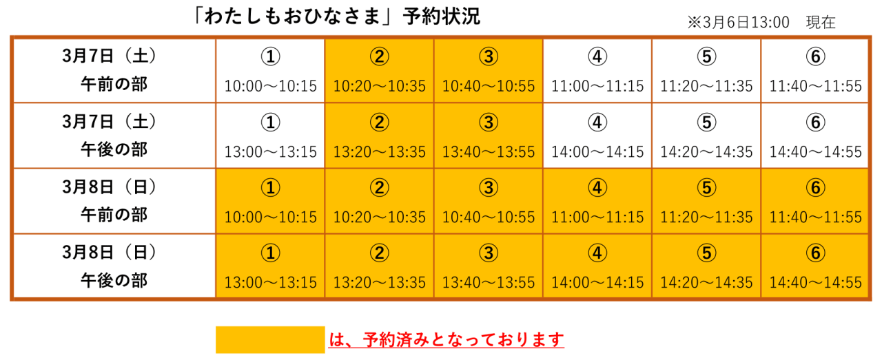 お申込みいただいた後、予約時間をご連絡いたします。先着順のため、ご希望に添えない場合があります。あらかじめご了承ください。
