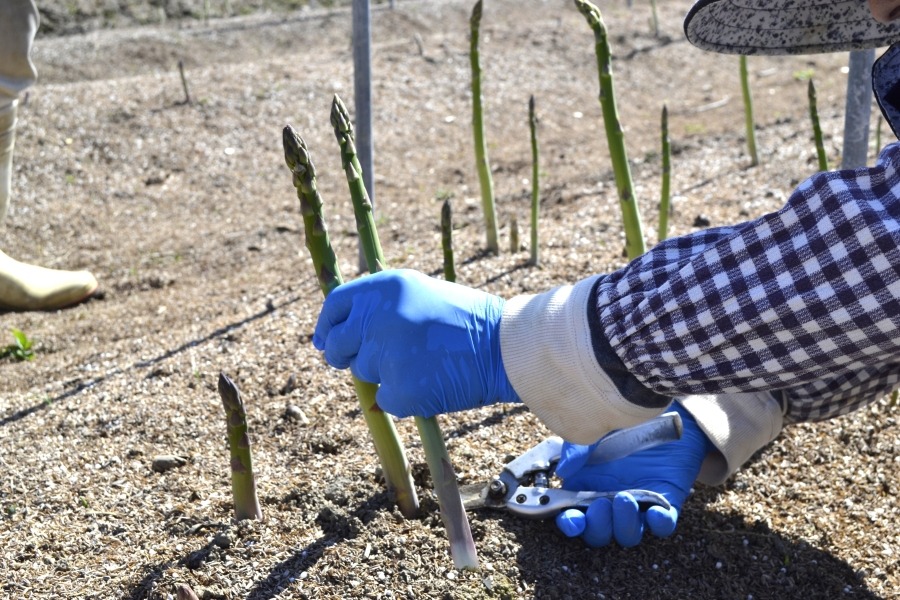 ハサミで簡単に収穫できる体験です。アスパラガス10~15本(約500グラム)をお持ち帰りいただけます。