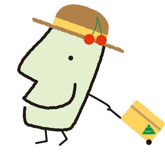 | きてけろくんについて | さくらんぼのブローチが付いた麦わら帽子をかぶり、「ペロリン」マークの付いた「おいしい山形」がぎっしり詰まった旅行バッグを持っています。 |