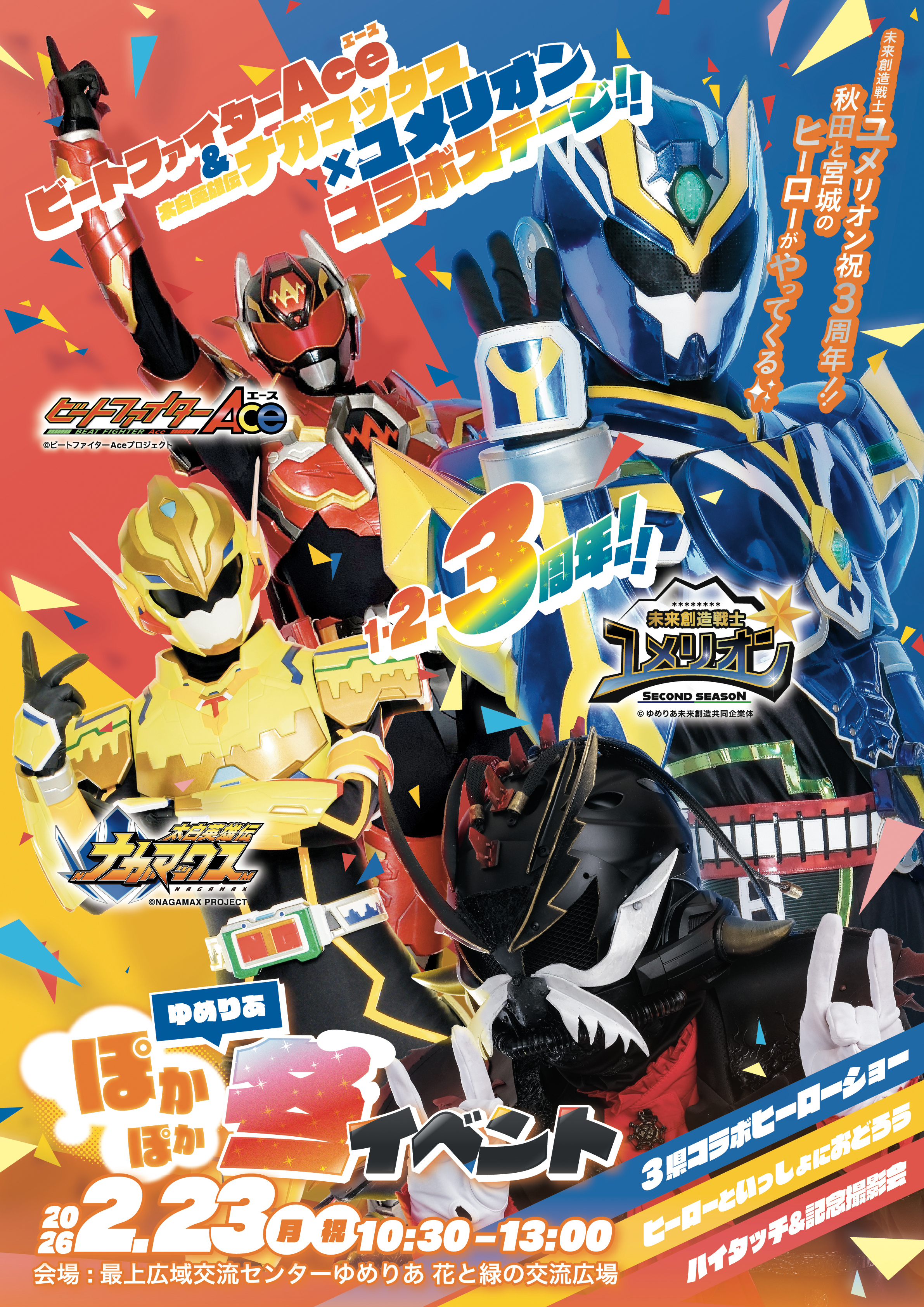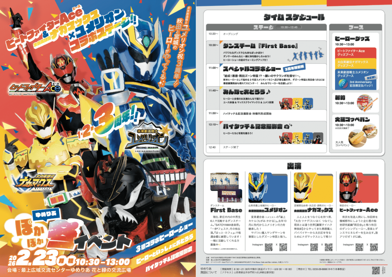 ゆめりあぽかぽか冬のイベント 2026年02月10日(火) 日 程: 2026年2月23日(月)10:30~12:30開催場所: ゆめりあ花と緑の交流広場内 容 【ステージ】 ・地元ダンスチームのみんなと体を動かそう! ・ユメリオン3周年特別編!3県コラボヒーローショー! ・ショーの後はみんなで楽しくダンス♪ ヒーローといっしょに踊ろう!【ブース】 ・3県それぞれのヒーローグッズブース ・楽しい射的コーナー ・大人気!大蔵コッペパン 3連休最終日はぜひゆめりあへお越しください!チラシはコチラから↓ ↓ ↓ チラシ表 チラシ裏 問い合わせ先 最上広域交流センターゆめりあ 電話番号 0233-28-8888
